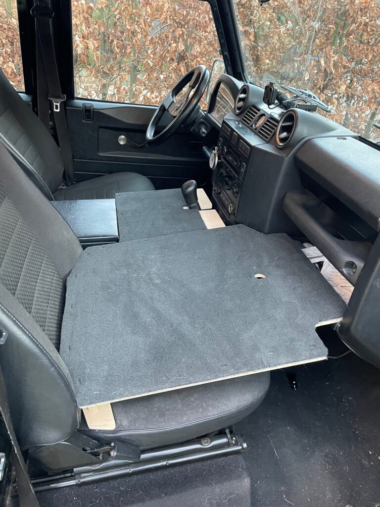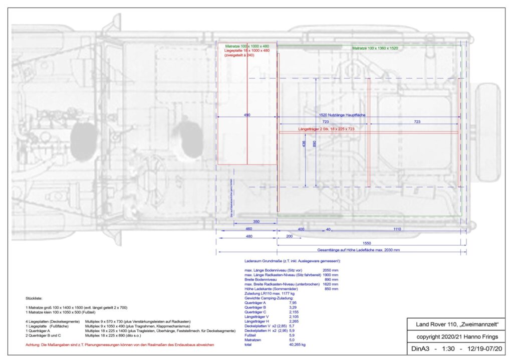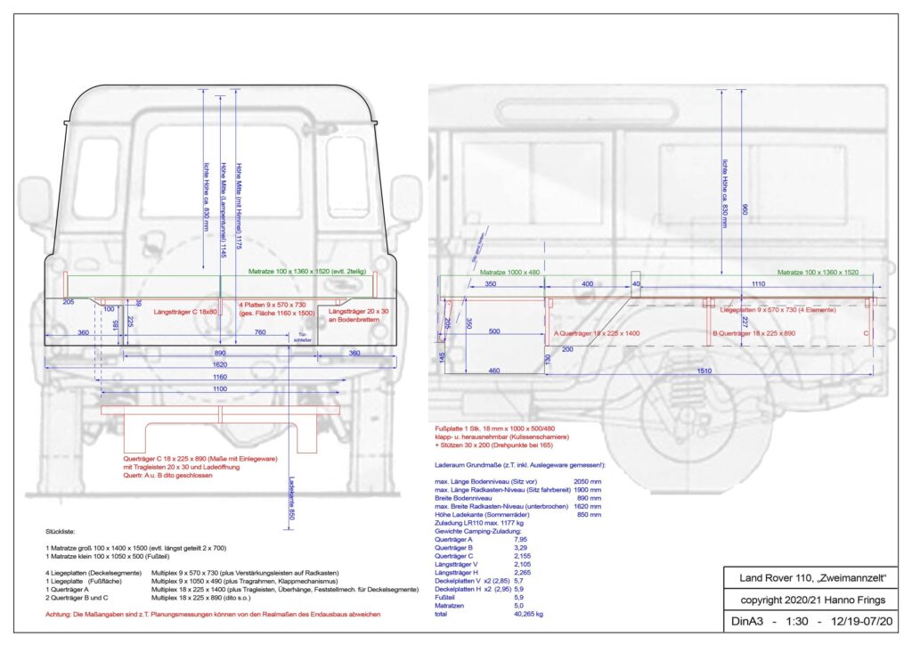 Hier noch der Konstruktionsplan. Alle Maße im Wagen sind eigenhändig ermittelt und können von anderen Defendern abweichen, z.B. wenn keine Auslegeware vorhanden ist. Also keine Gewähr, nachmachen auf eigenes Risiko.