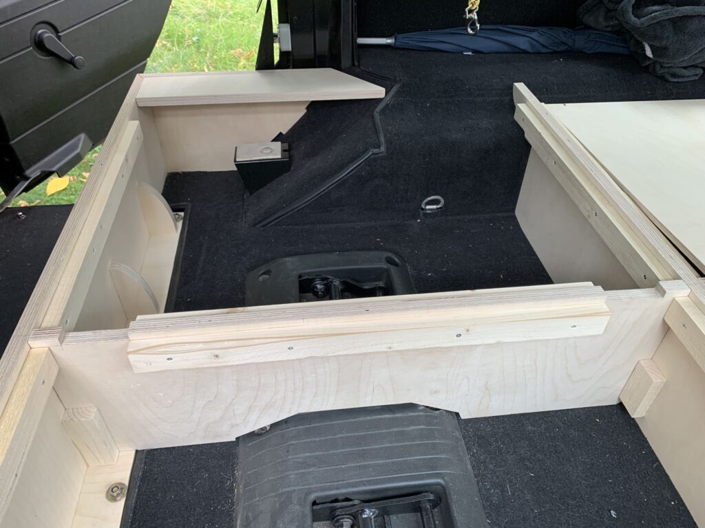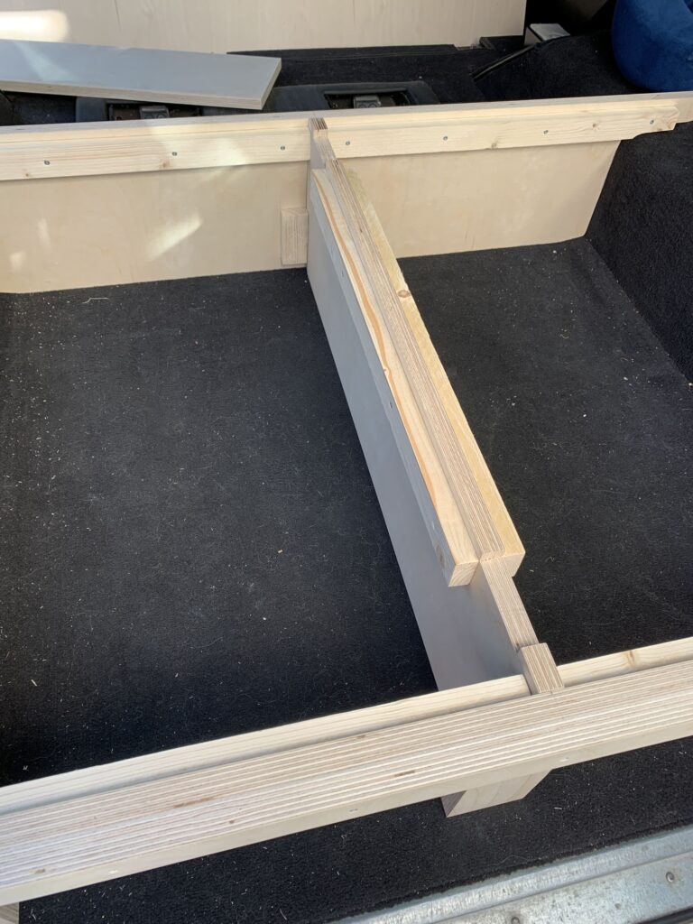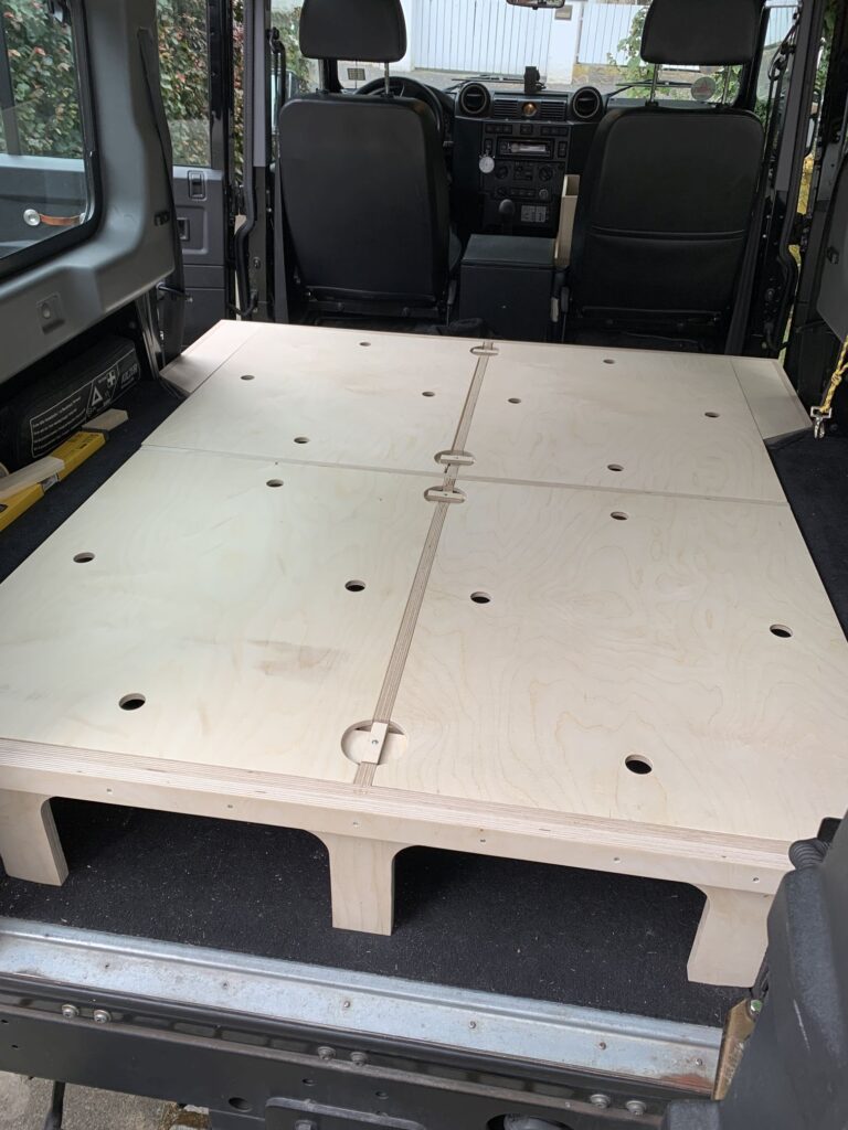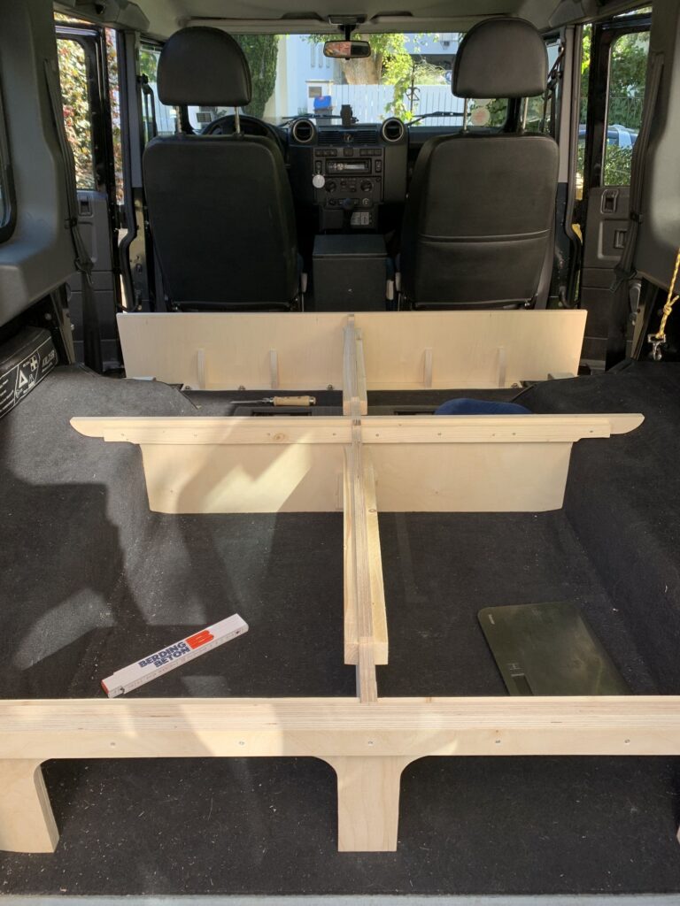 Die Schotts 2 und 3 waren eher leichte Arbeit. Wenn beim Einbau die drei Querschotts stehen, werden die beiden kurzen Längstschotts dazwischen gesteckt. So entsteht eine stabile und selbsttragende Konstruktion. Alle Schotts haben Verstärkungen und horizontale Leisten als Auflage für die Stauraumdeckel, die nur eingelegt sind. Die beiden hinteren Schotts sind mit kurzen Zurrgurten an den im Landy vorhandenen Befestigungsschlaufen auf dem Boden fixiert.