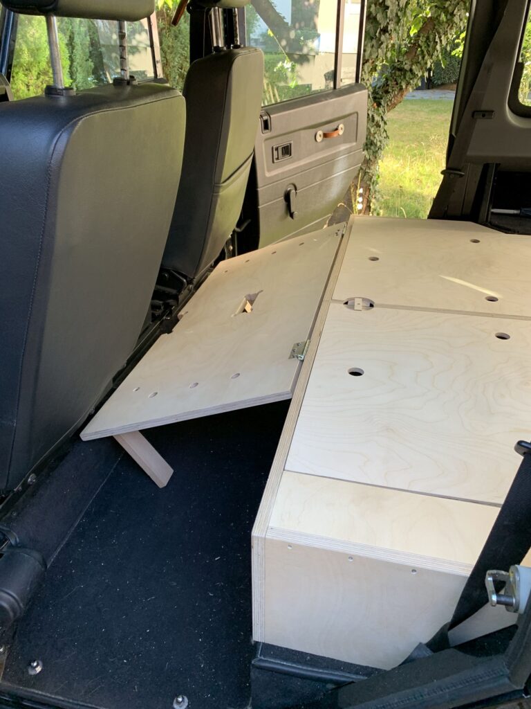 Also Pläne zeichnen (für Insider: Das beste CAD für den Heimeinsatz ist und bleibt Photoshop), Stückliste erstellen, bauen. Heraus gekommen ist etwas, was ich meinen Bootsausbau nenne. Die Grundidee mußte ich nicht neu erfinden, das Netz ist voll davon. Egal, ob VW-Bus, Landy oder sonst was: Hintersitze raus, Kisteneinbau mit Stauraum und Liegefläche rein. Und macht auch nix, wenn’s nett aussieht.