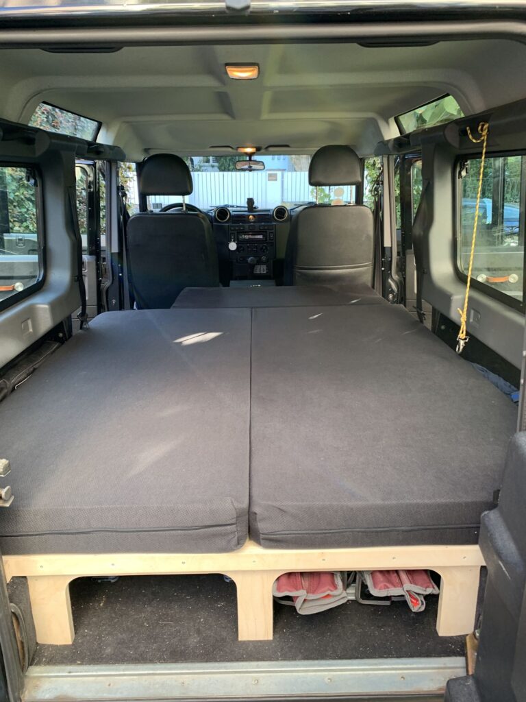 Insgesamt komme ich auf eine Bettlänge von 2,10 m. Die Breite ist 1,40 m, weil ich seitlich von den Matratzen Ablagefläche haben wollte. Man könnte auch die volle Breite im Landy ausnutzen und käme so auf ca. 1,60 m Liegefläche. Uns reichen die 1,40 .